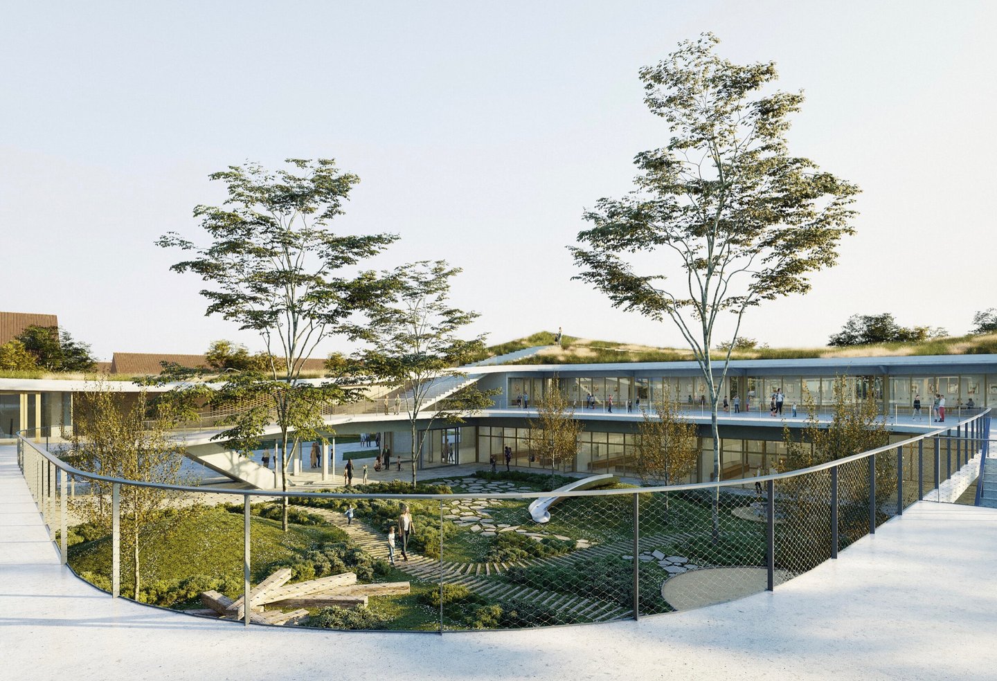 L'intérieur offre un univers ludique et protégé, favorisant le bien-être, la rencontre et la frugalité, avec des écrans vitrés s'ouvrant sur un écrin de verdure.