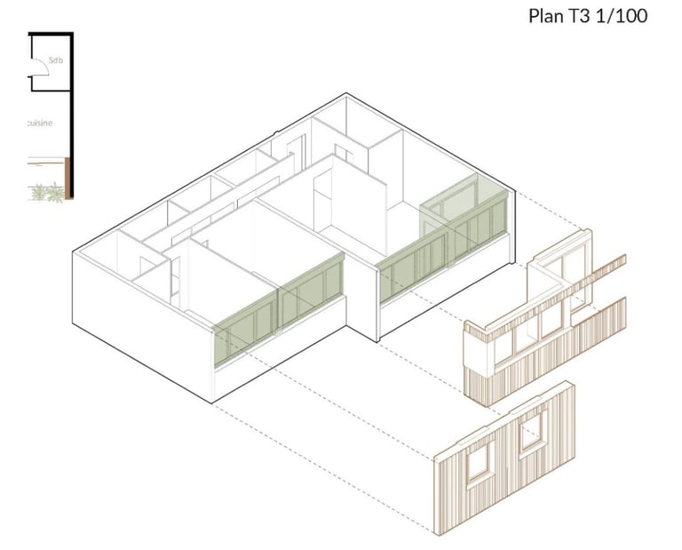 L’intervention vise à améliorer la qualité de vie des habitants par l’agrandissement des logements, avec des extensions pour les T1 et T2 et l’ajout de loggias et balcons pour les T3 et T4. Le projet propose également une requalification architecturale des façades et la création d’espaces conviviaux en rez-de-chaussée, offrant une nouvelle identité aux immeubles.