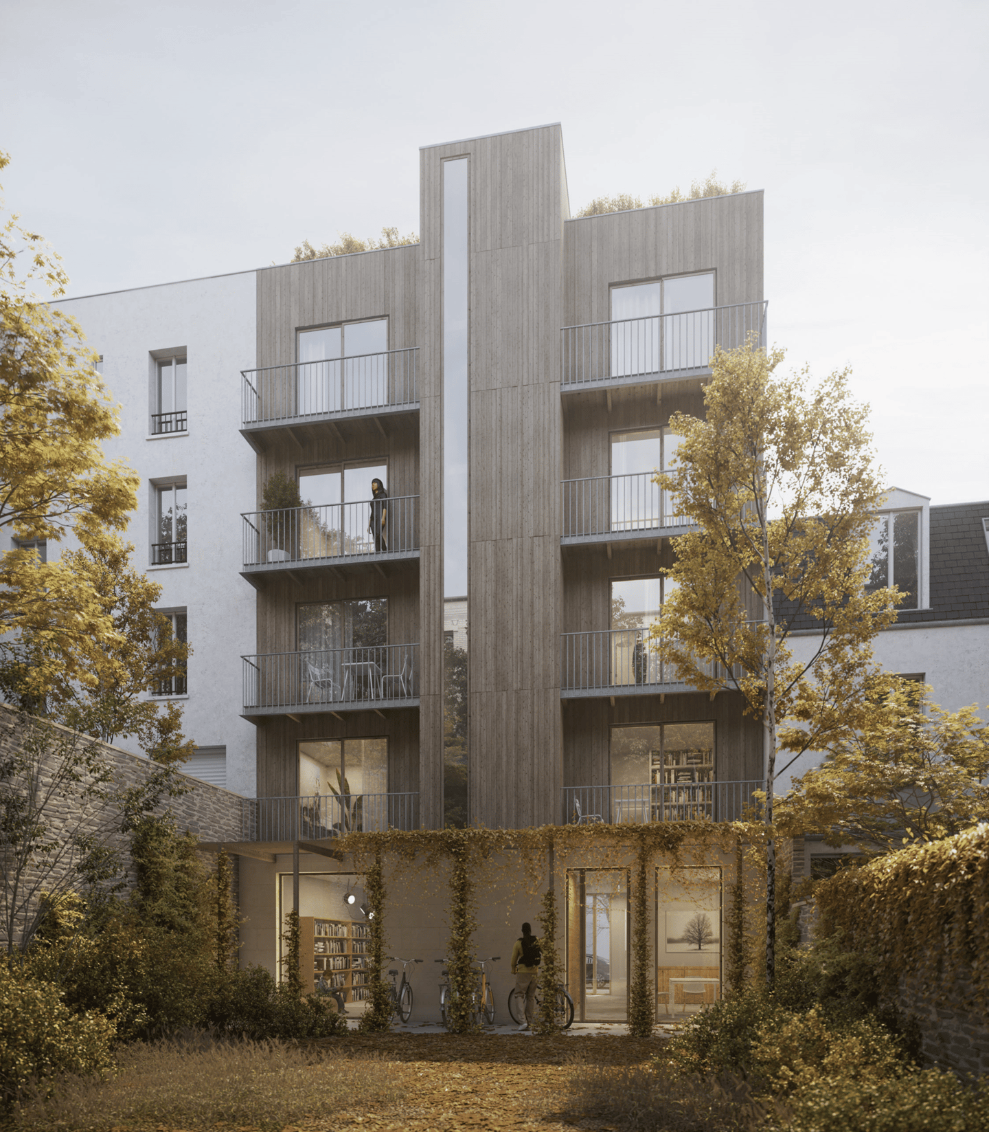 L’immeuble comprend 8 logements traversants, une loge de gardien, un commerce en rez-de-chaussée et une toiture partagée végétalisée avec jardin potager. Chaque étage accueille deux appartements optimisés pour le confort lumineux, la ventilation naturelle et la qualité de vie.